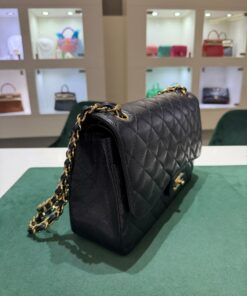 Chanel classica grande jumbo NUOVA caviar doppia patta pelle vitello martellato & effetto dorato nero interno bordeaux con microchip. Lunghezza 30cm full set NUOVA FULL STICKERS full pellicole con scontrino ufficiale Chanel più certificato Entrupy. dustbag e scatola Misure 30 x 19 x 9