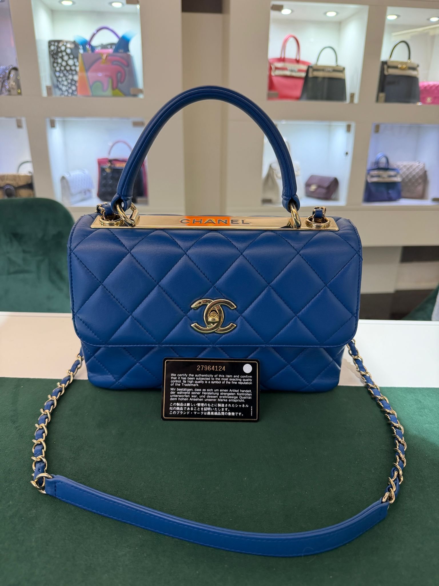 Chanel trendy CC misura media 25 con Card Chanel del 2019 e certificato Entrupy Color bleu ( blue royal ) con hardware dorato.