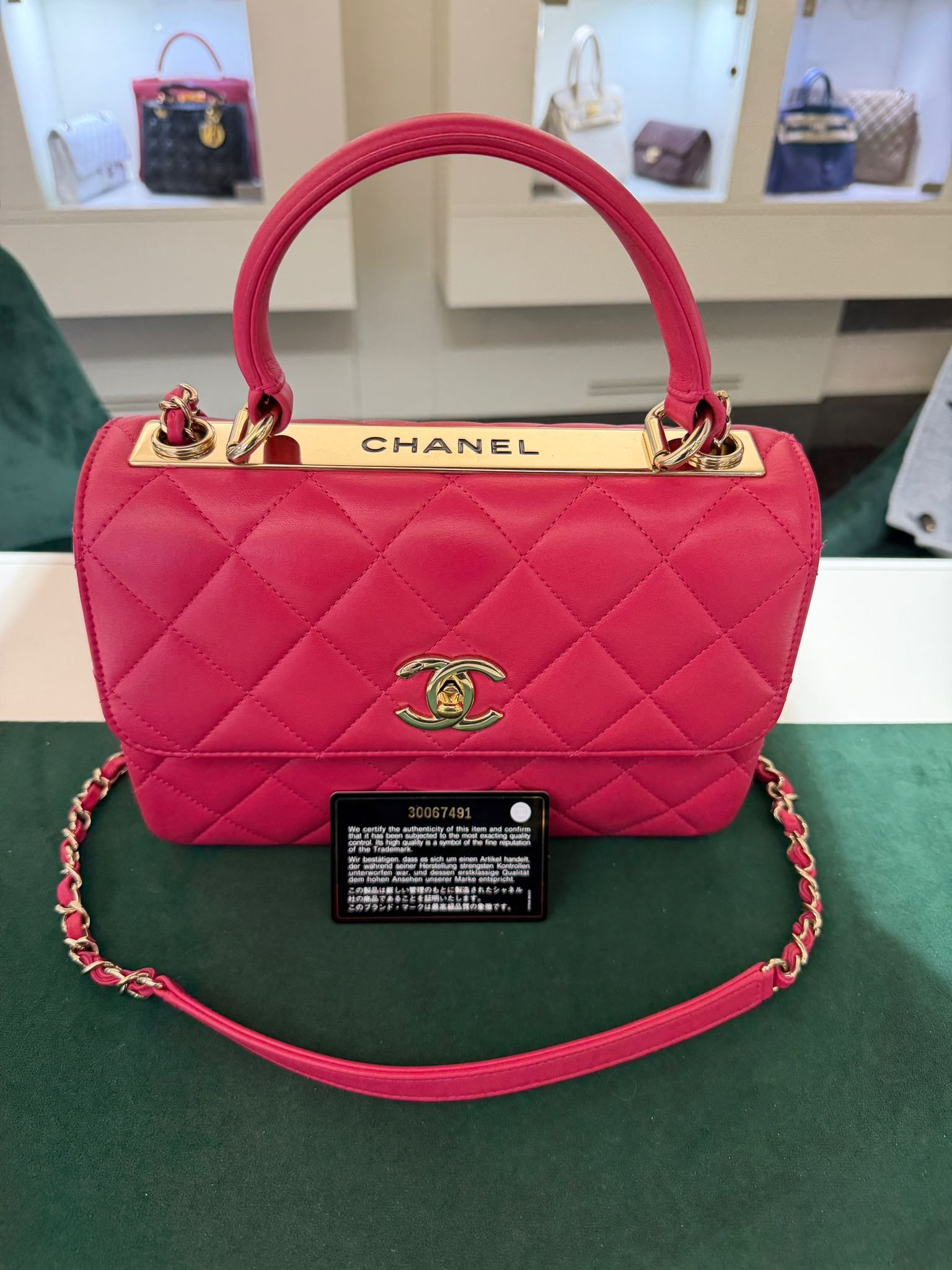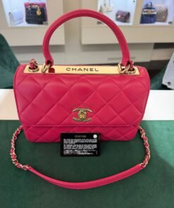Chanel trendy CC misura media 25 con Card Chanel del 2020 e certificato Entrupy Color Fuchsia (Rose Fuchsia) con hardware dorato.