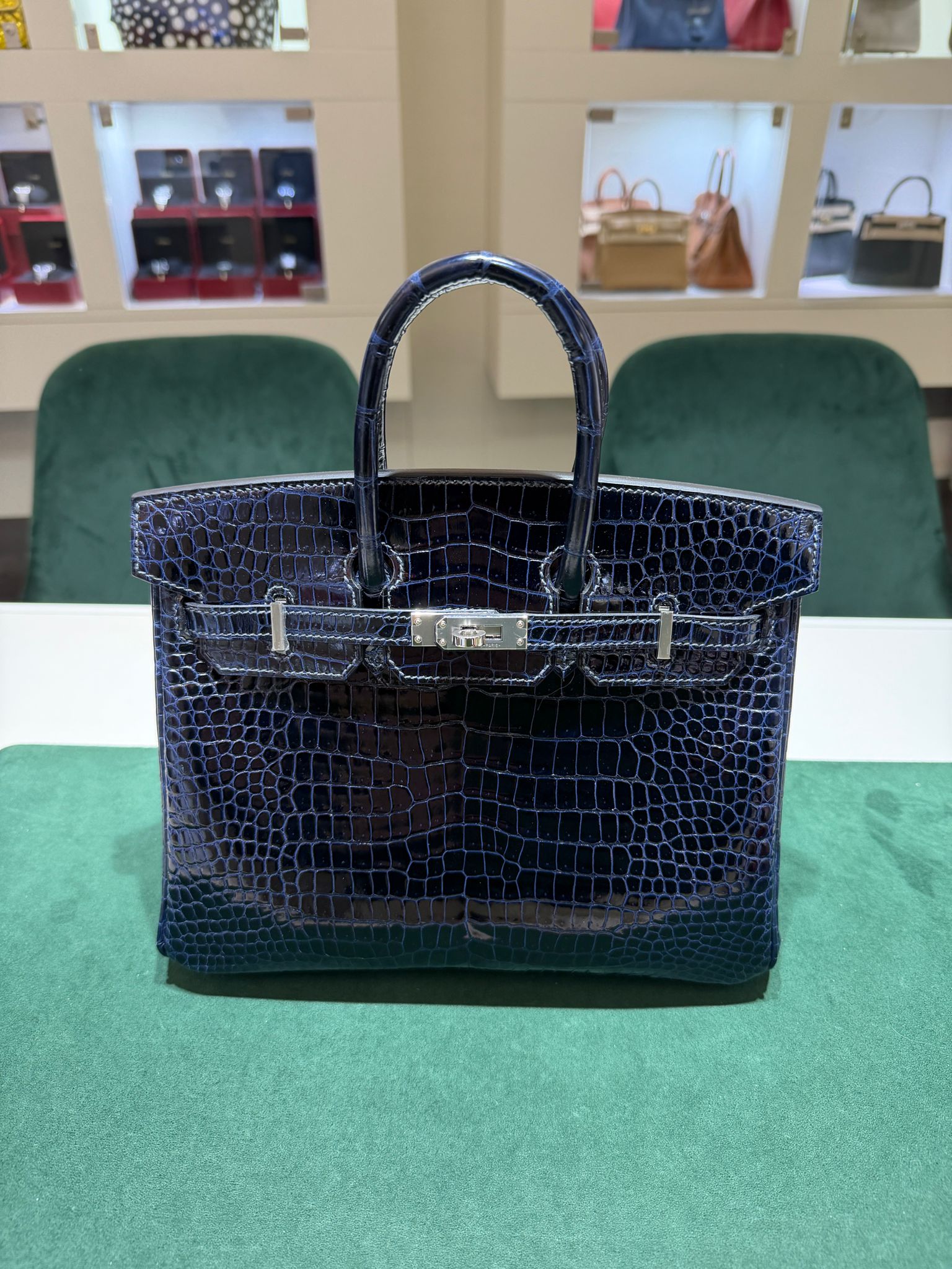 Hermès Birkin 25 crocodile poro porosus lisse australiano stampa W NUOVA full stickers colore bleu marine hardware palladio full set con scontrino ufficiale Hermès full set e deroga Cites