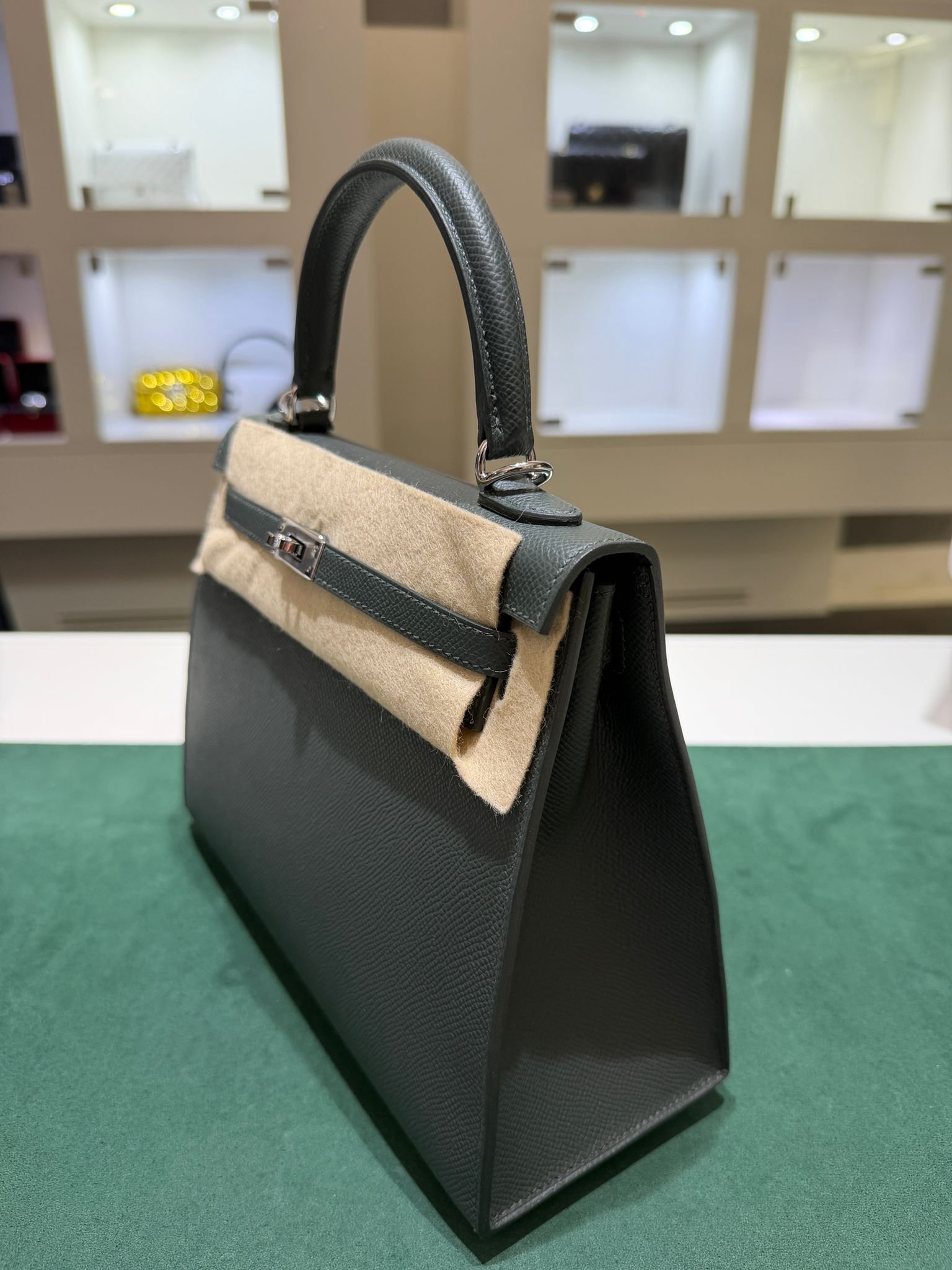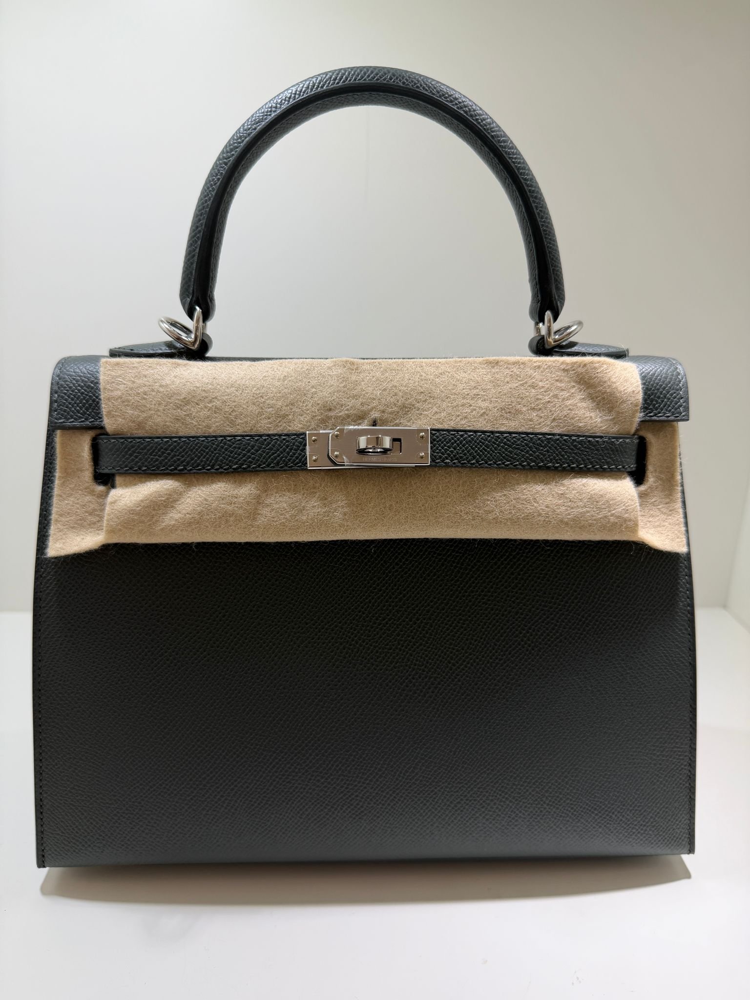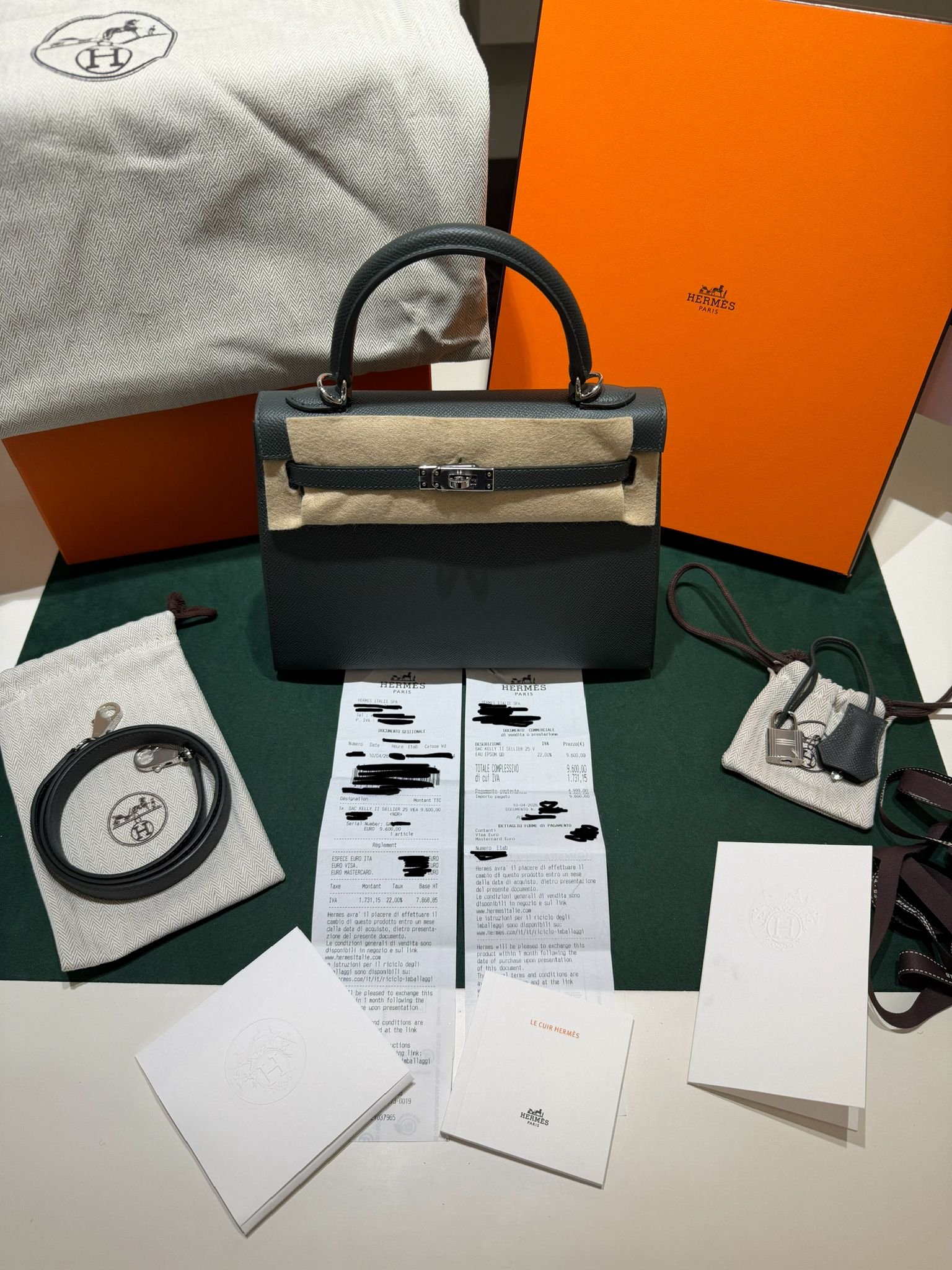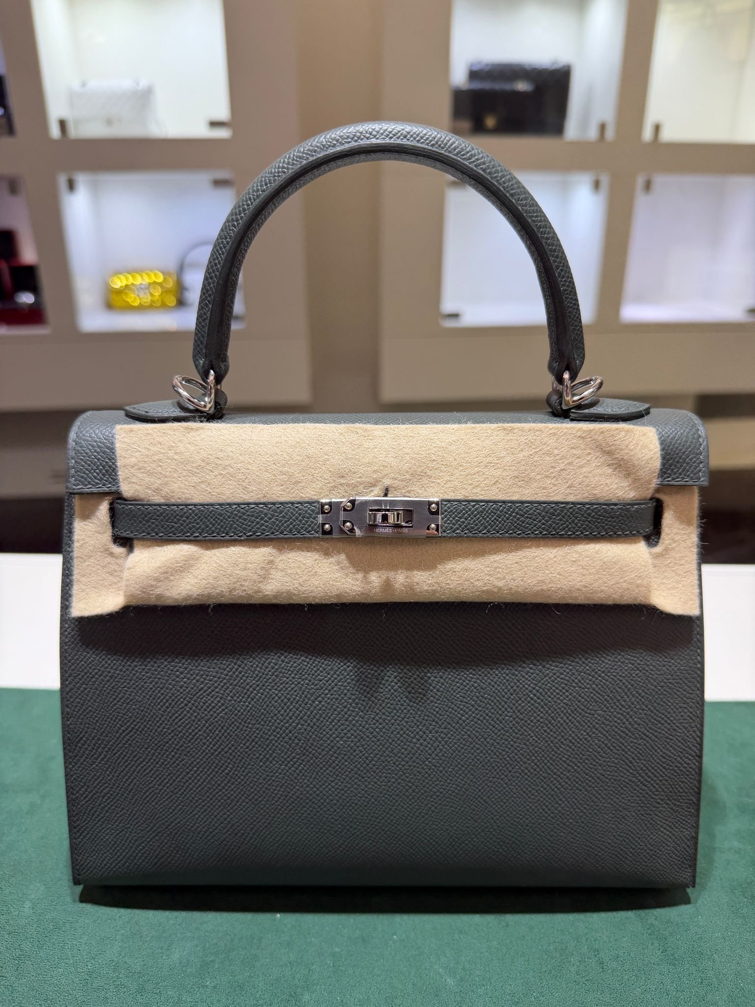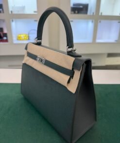 Hermès Kelly 25 Sellier Nuova 2026 stampa G in pelle Epsom colore vert mangrove con hardware palladio con tutti gli adesivi di protezione dell’imballaggio e dell’hardware.