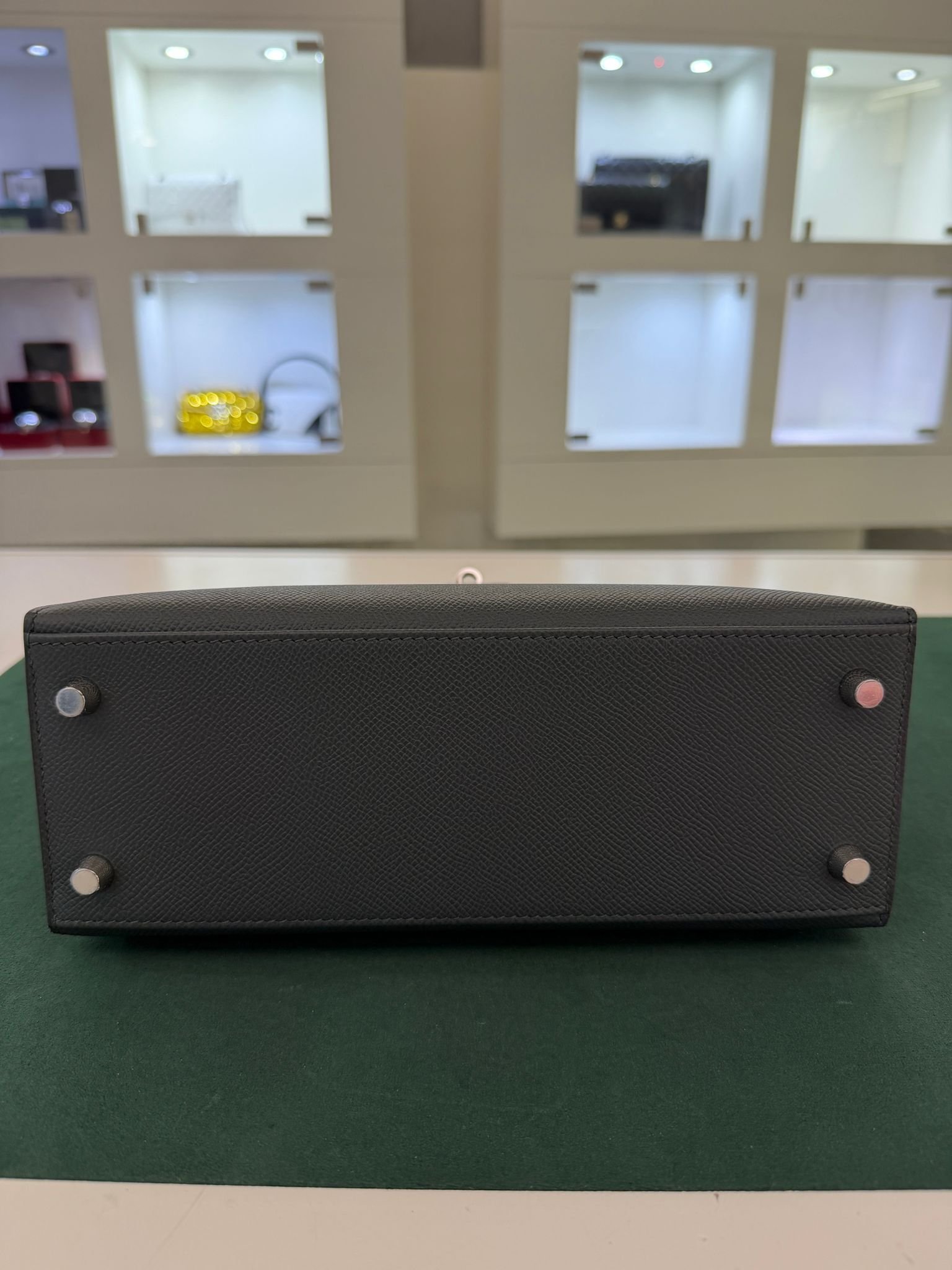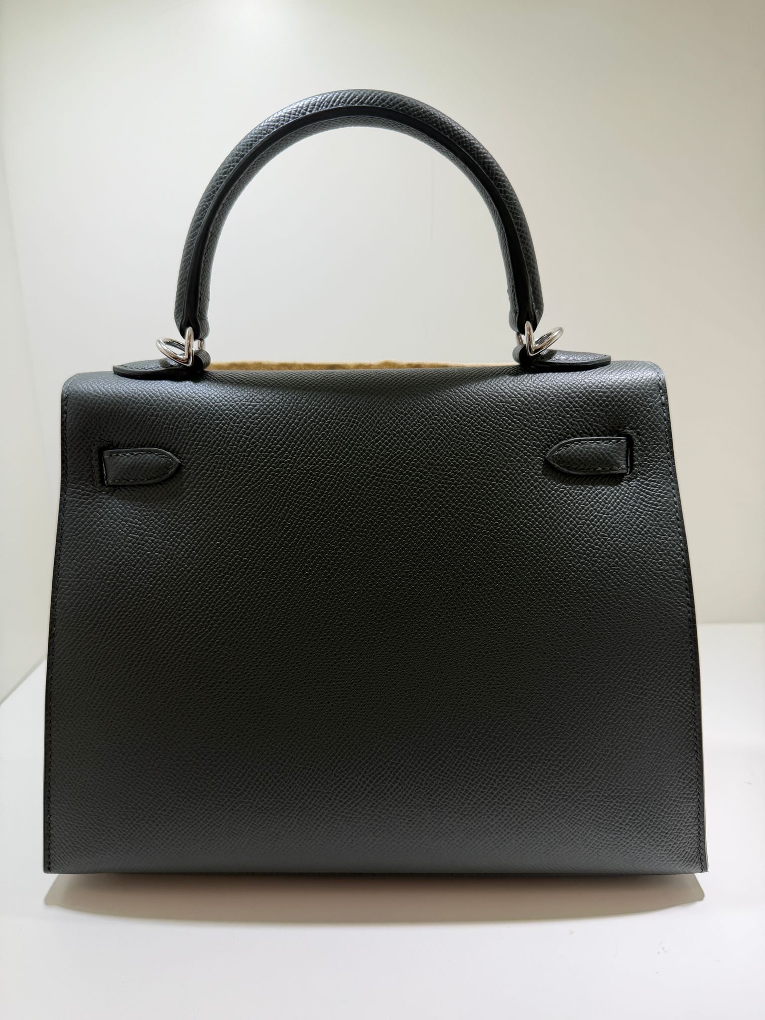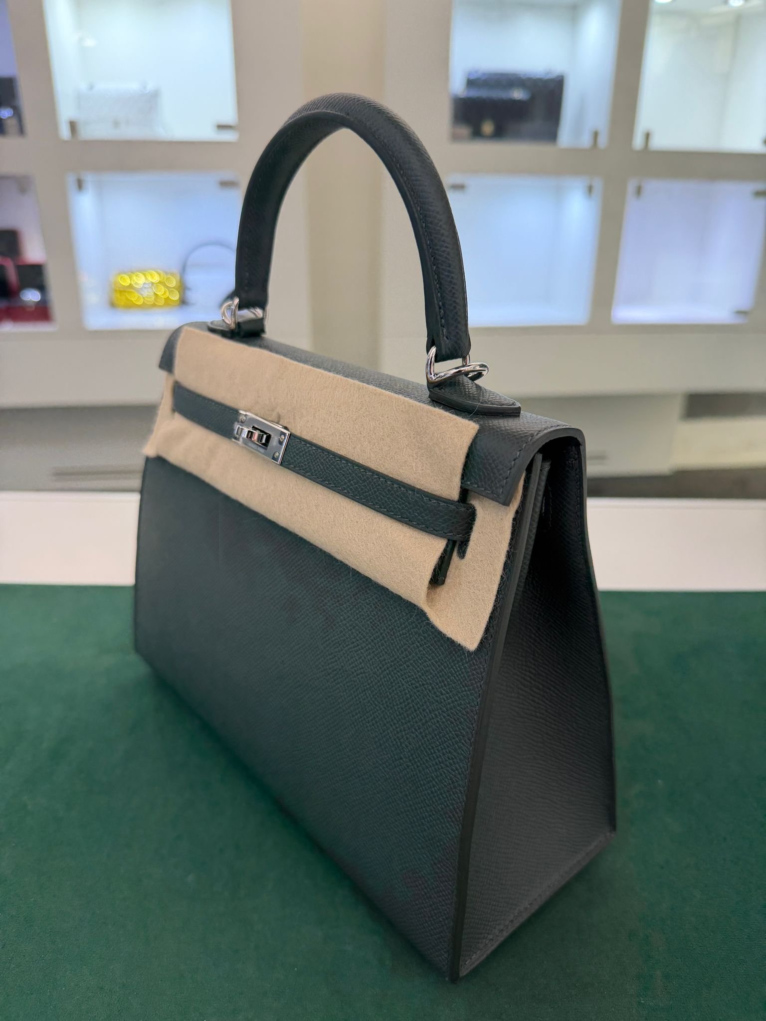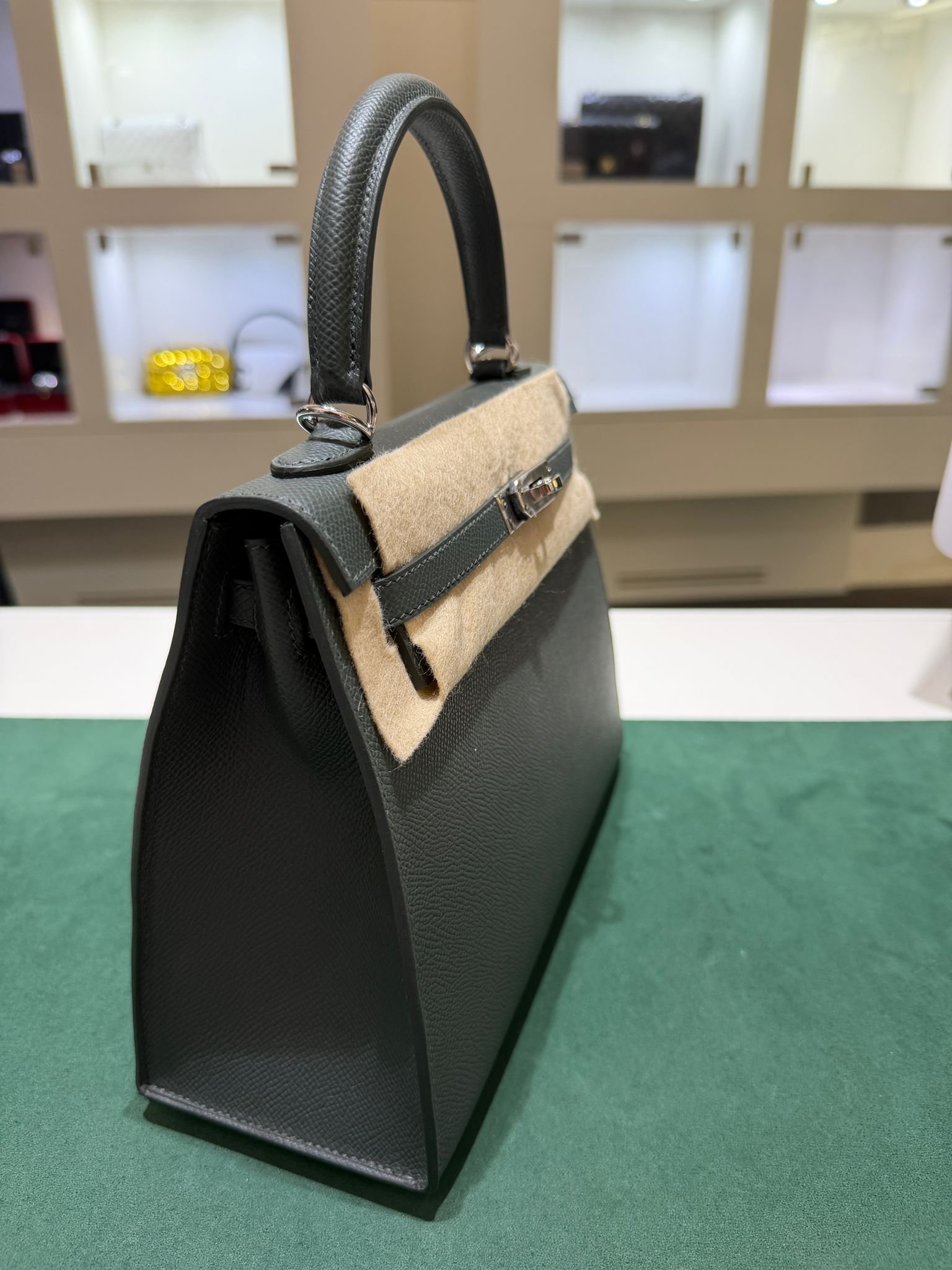 Hermès Kelly 25 Sellier Nuova 2026 stampa G in pelle Epsom colore vert mangrove con hardware palladio con tutti gli adesivi di protezione dell’imballaggio e dell’hardware.