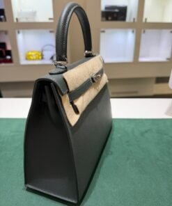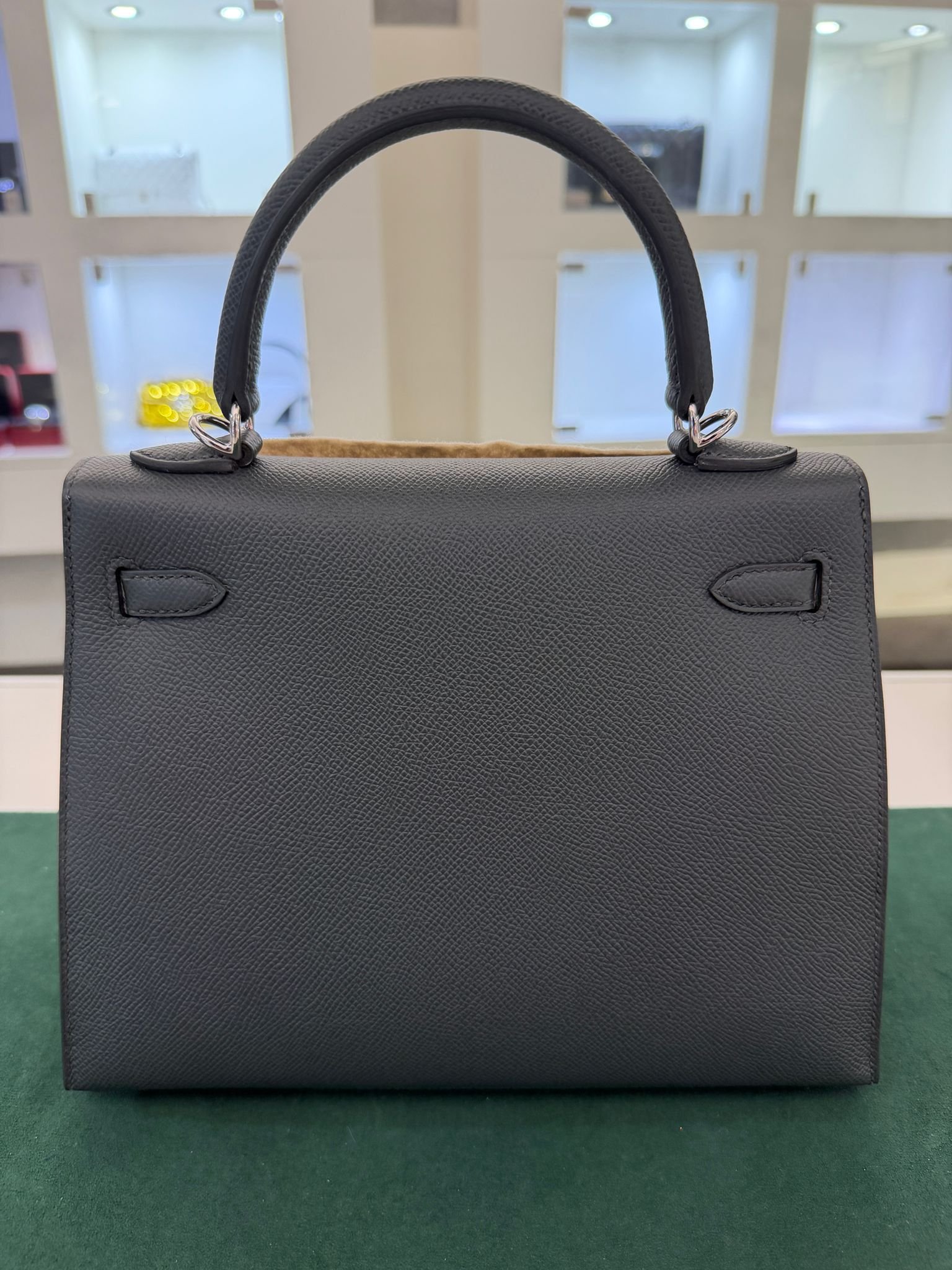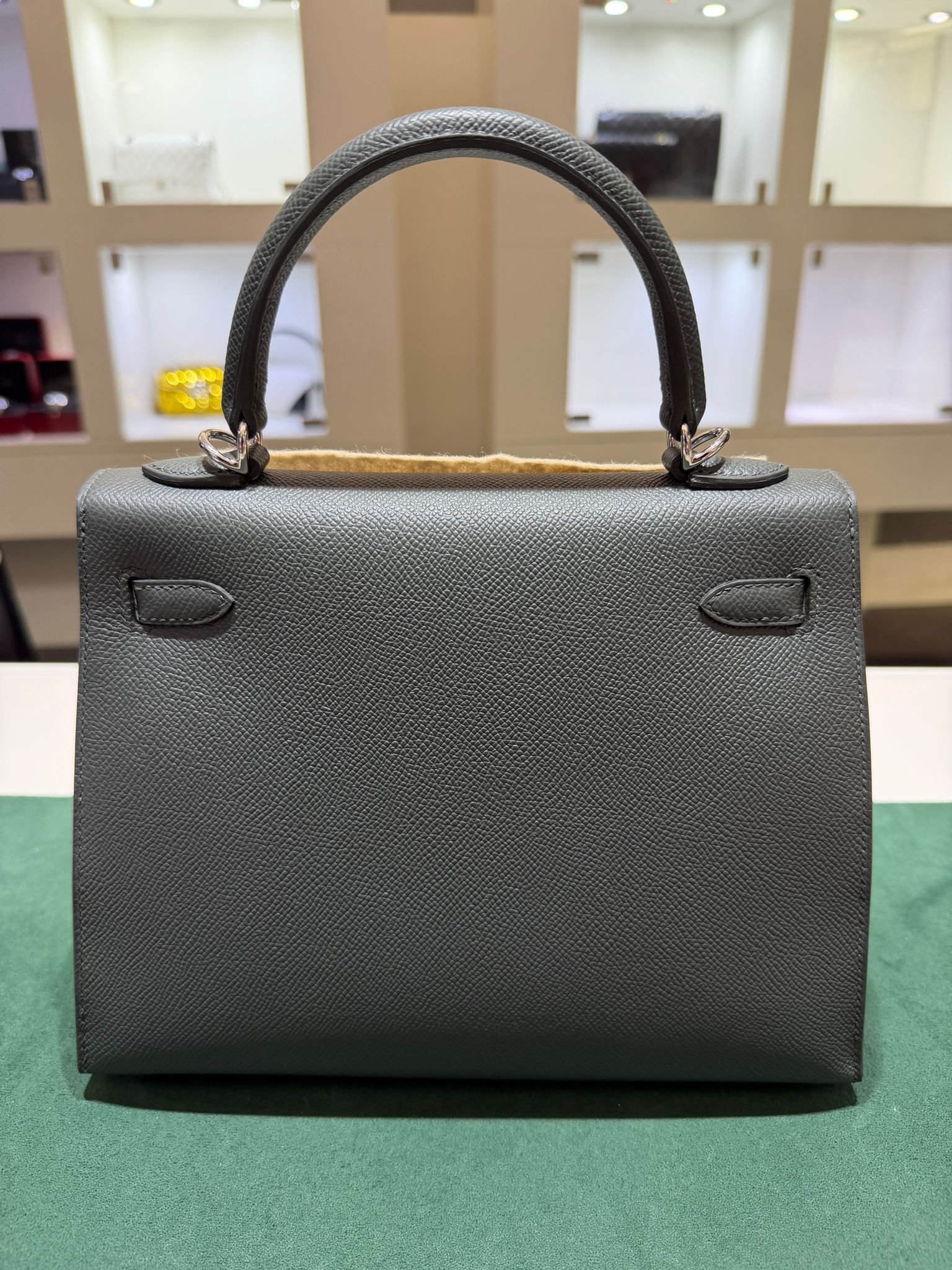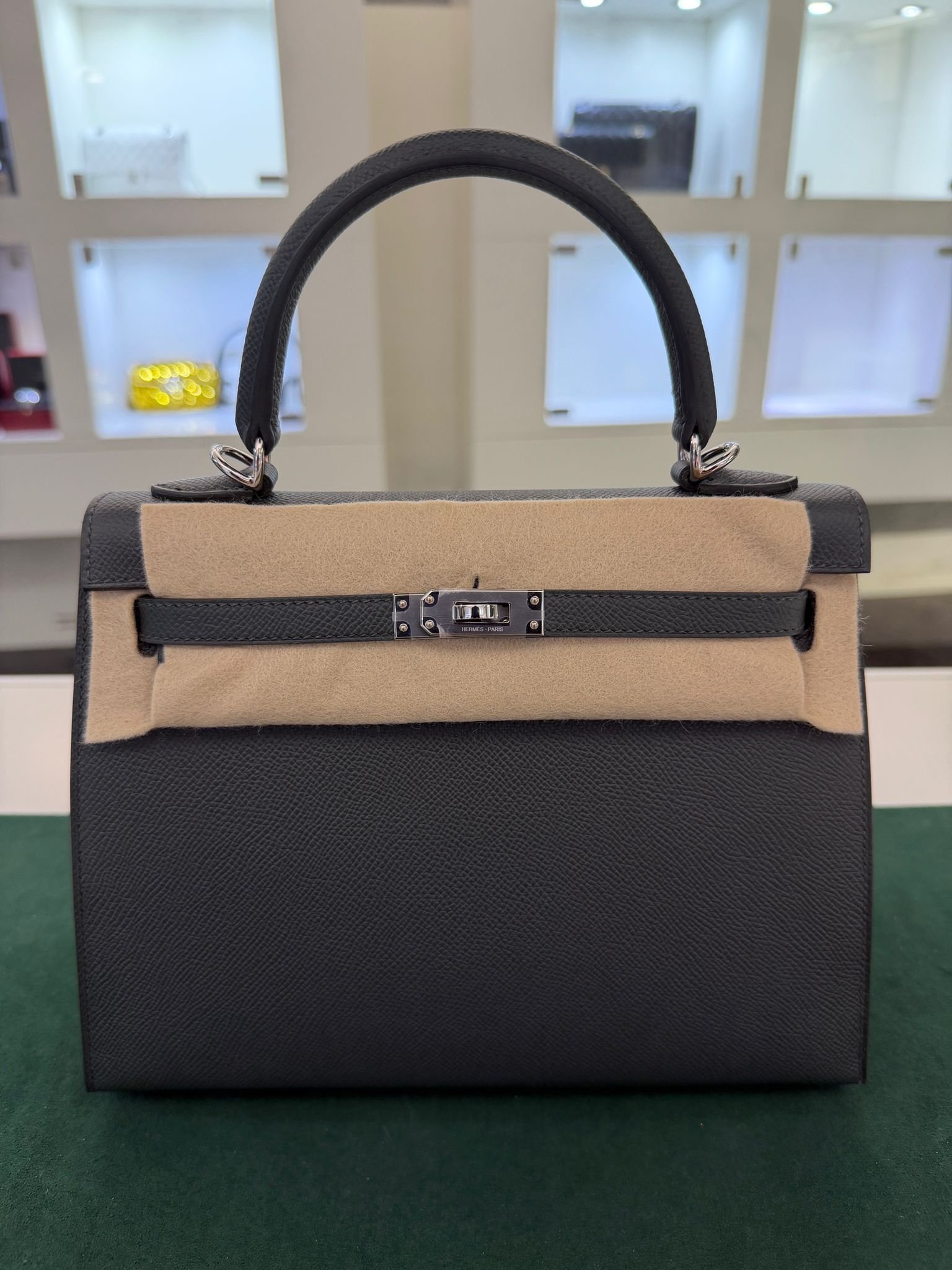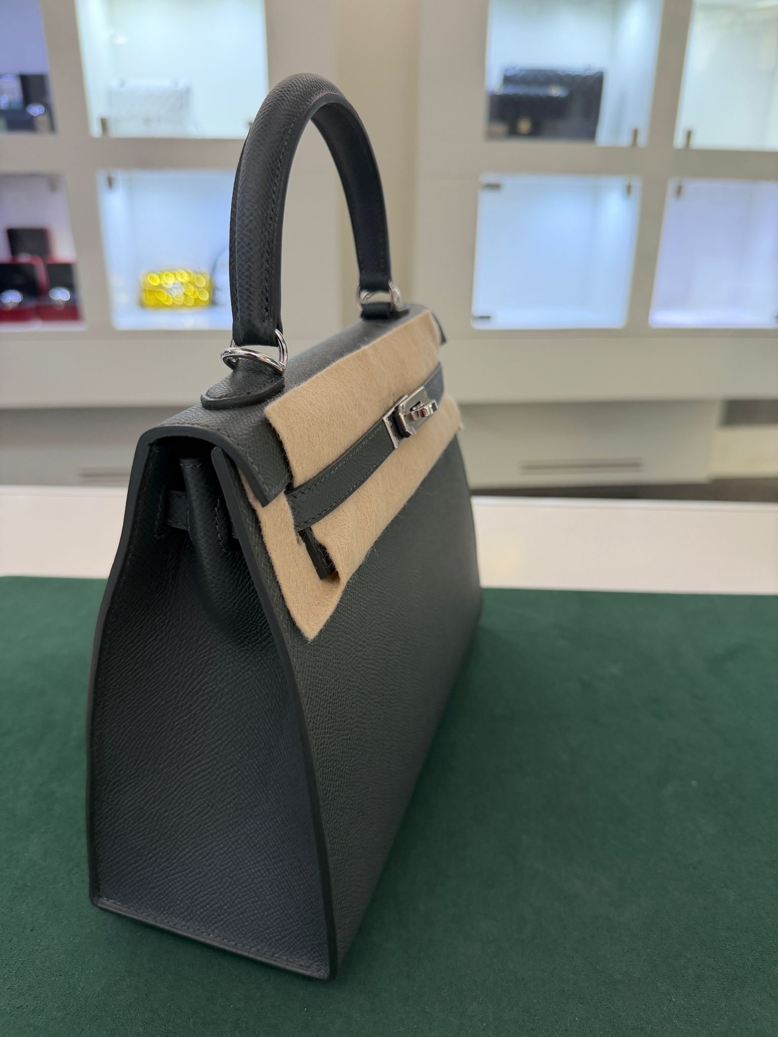 Hermès Kelly 25 Sellier Nuova 2026 stampa G in pelle Epsom colore vert mangrove con hardware palladio con tutti gli adesivi di protezione dell’imballaggio e dell’hardware.