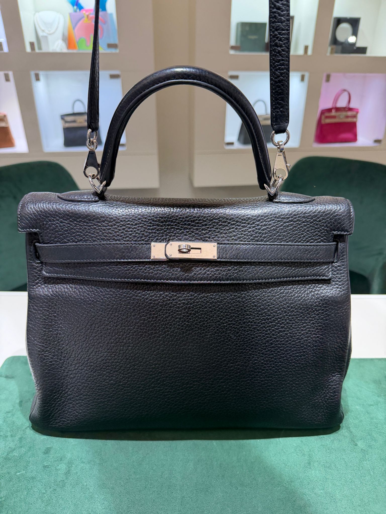 Hermès Kelly 35 retourne sacs Et voyage del 2013 second hand color noir full set top condition rigenerata spa Hermes nel Marzo 2024. Hardware palladio con lucchetto e tracolla.