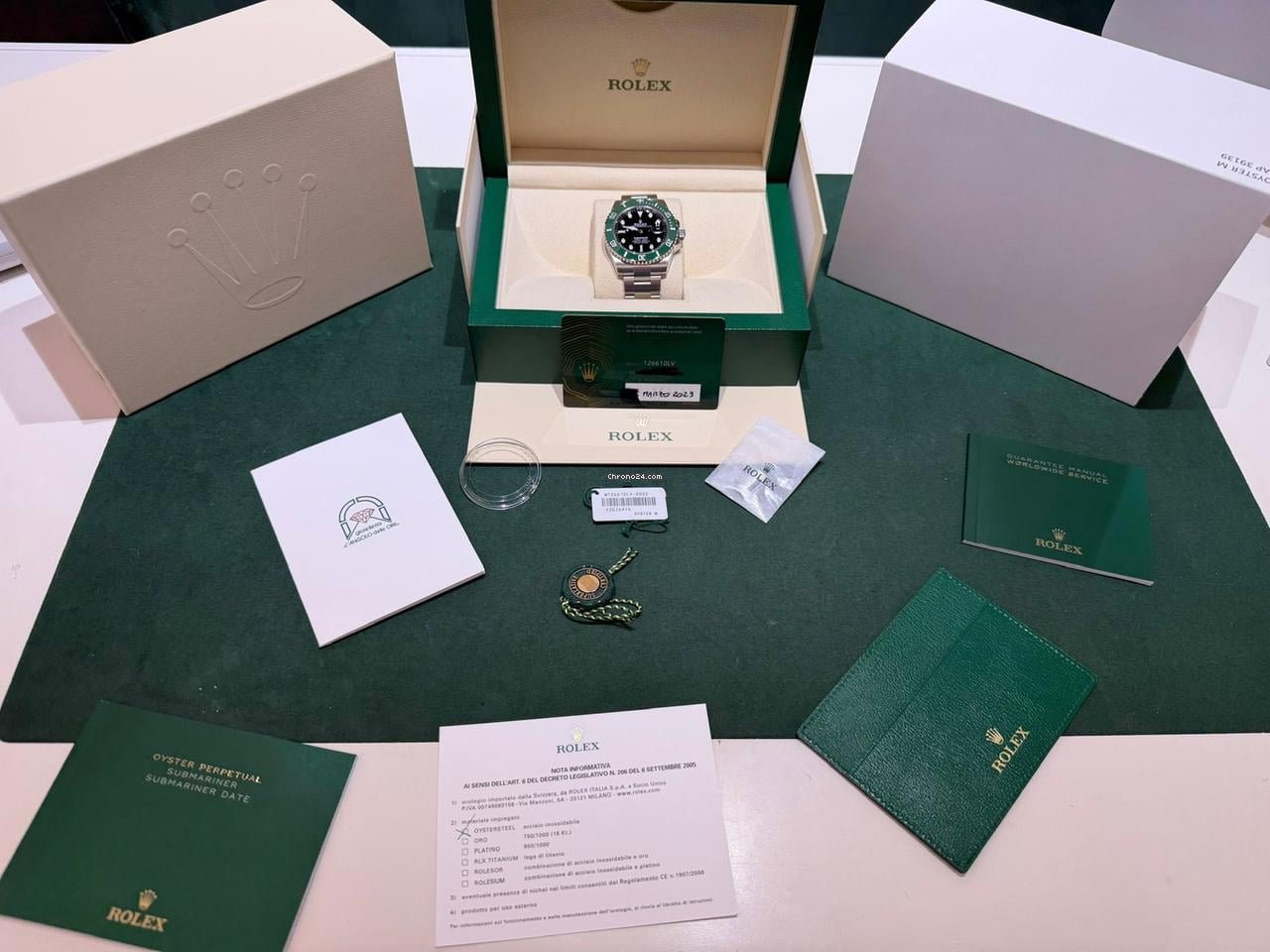 Full set certificato e scatola. Certificato della nostra azienda per 12 mesi su qualsiasi malfunzionamento. Certificato sull’originalità dei suoi pezzi e sulla lecita provenienza. Spedizione con Portavalori guardie armate assicuriamo l’intero importo per il valore dell’orologio.